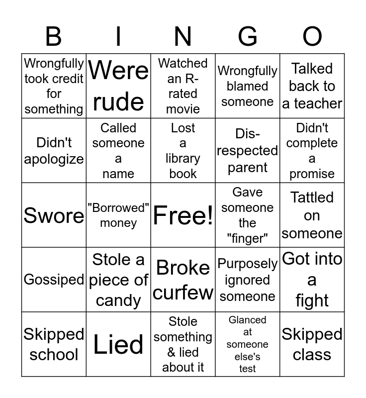 This bingo card has a free space and 24 words: Stole a piece of candy, Lied, Lost a library book, Skipped school, Talked back to a teacher, Wrongfully took credit for something, Didn't apologize, Were rude, Gave someone the "finger", Broke curfew, Dis- respected parent, Swore, Purposely ignored someone, Got into a fight, Called someone a name, Glanced at someone else's test, Tattled on someone, Watched an R-rated movie, Didn't complete a promise, "Borrowed" money, Skipped class, Gossiped, Wrongfully blamed someone and Stole something & lied about it.