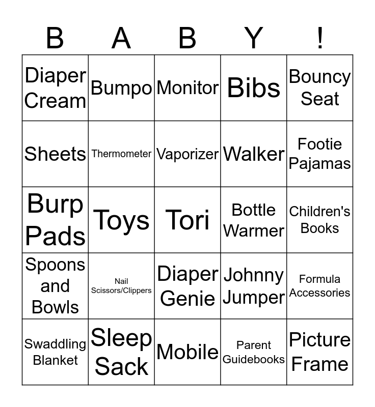 This bingo card has a free space and 27 words: Johnny Jumper, Exer-Saucer, Walker, Mobile, Sheets, Monitor, Bumpo, Spoons and Bowls, Bottle Warmer, Formula Accessories, Burp Pads, Bibs, Swaddling Blanket, Sleep Sack, Footie Pajamas, Hats, Thermometer, Vaporizer, Nail Scissors/Clippers, Diaper Cream, Children's Books, Parent Guidebooks, Toys, Picture Frame, Diaper Genie, Bouncy Seat and Swing.