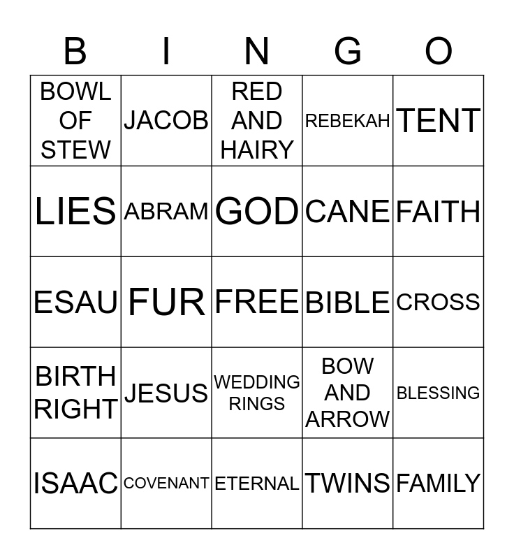 This bingo card has a free space and 24 words: JESUS, COVENANT, GOD, ISAAC, TENT, BOWL OF STEW, LIES, JACOB, BIBLE, WEDDING RINGS, CANE, ESAU, BOW AND ARROW, BLESSING, ABRAM, TWINS, CROSS, RED AND HAIRY, FAITH, FUR, FAMILY, BIRTH RIGHT, REBEKAH and ETERNAL.
