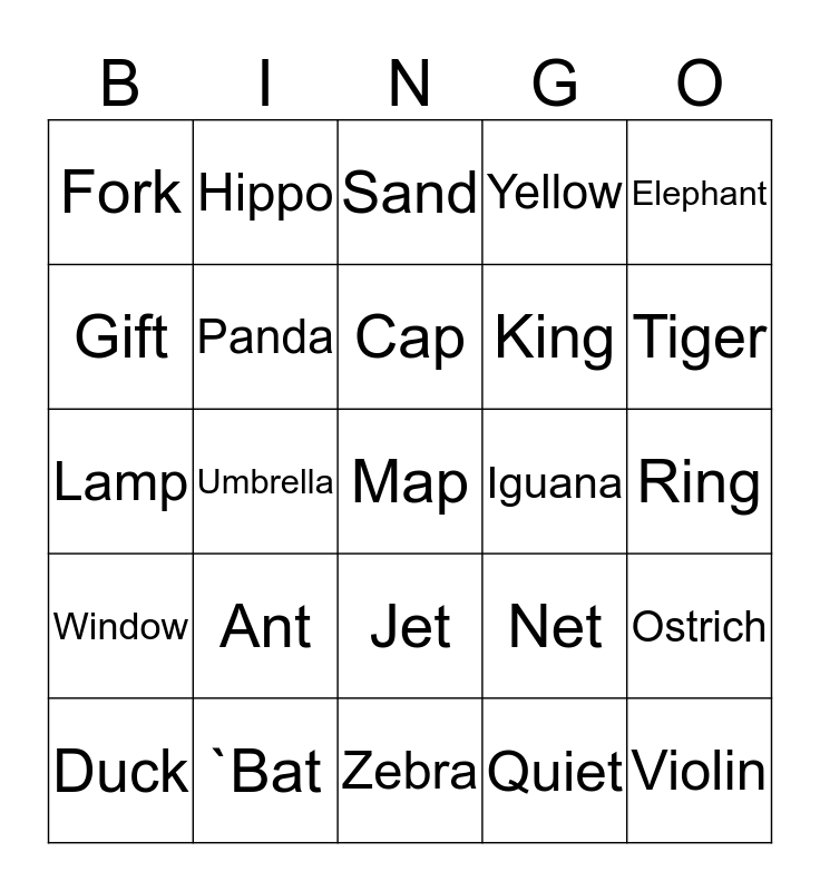 This bingo card has a free space and 24 words: Ant, `Bat, Cap, Duck, Elephant, Fork, Gift, Hippo, Iguana, Jet, King, Lamp, Net, Ostrich, Panda, Quiet, Ring, Sand, Tiger, Umbrella, Violin, Window, Yellow and Zebra.