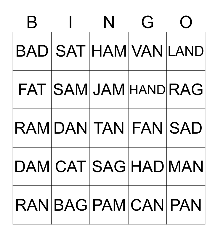 This bingo card has a free space and 24 words: CAT, BAG, JAM, RAN, LAND, BAD, FAT, SAT, FAN, SAG, HAND, RAM, HAD, MAN, SAM, CAN, SAD, HAM, RAG, DAN, PAN, DAM, VAN and PAM.