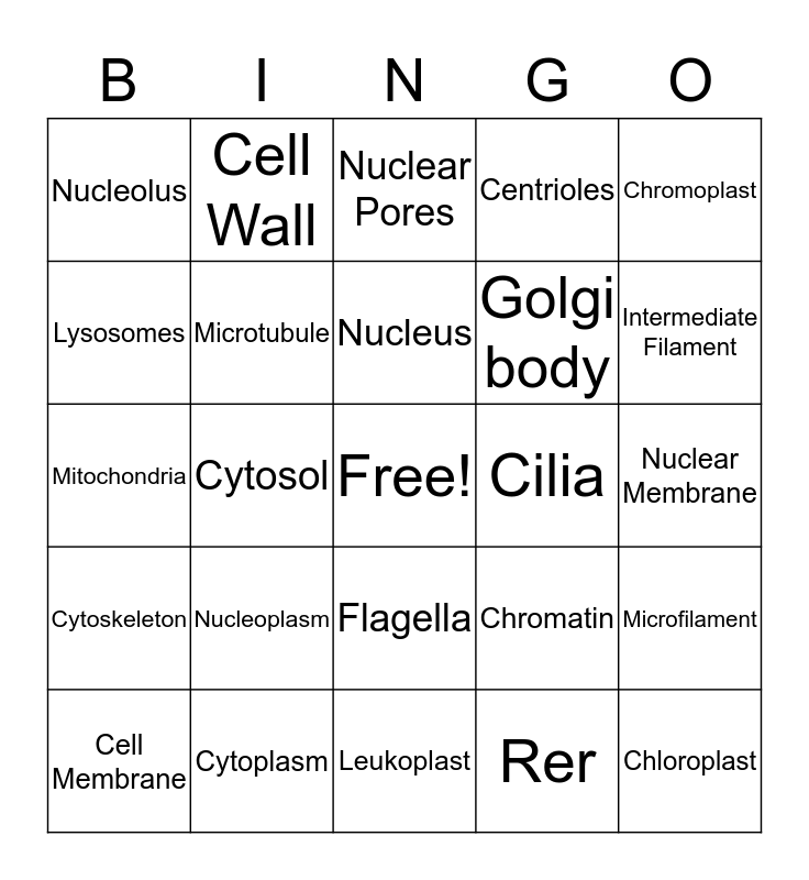 This bingo card has a free space and 24 words: Cell Membrane, Nucleoplasm, Nucleus, Rer, Chromoplast, Nucleolus, Cell Wall, Nuclear Pores, Cilia, Nuclear Membrane, Mitochondria, Microtubule, Chromatin, Microfilament, Lysosomes, Cytoplasm, Leukoplast, Centrioles, Intermediate Filament, Cytoskeleton, Cytosol, Flagella, Golgi body and Chloroplast.