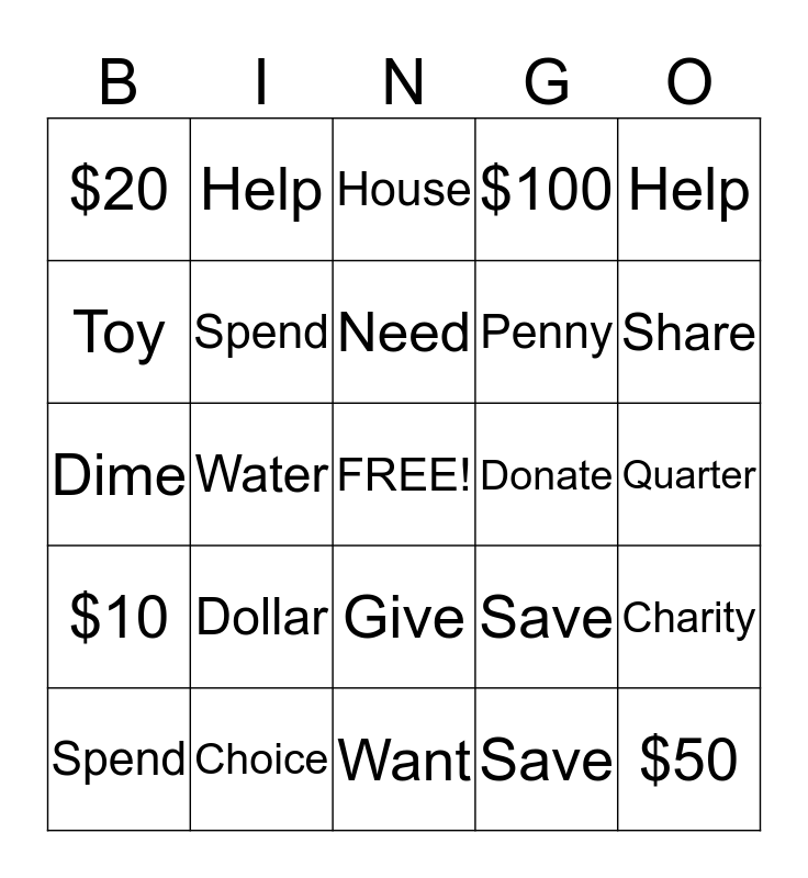 This bingo card has a free space and 27 words: Save, $6, Penny, Want, Toy, House, Help, $10, Donate, Charity, Dime, $100, Spend, Choice, Share, Bank, Spend, Need, Dollar, $20, Quarter, Save, Water, $50, Give, Help and $1000.