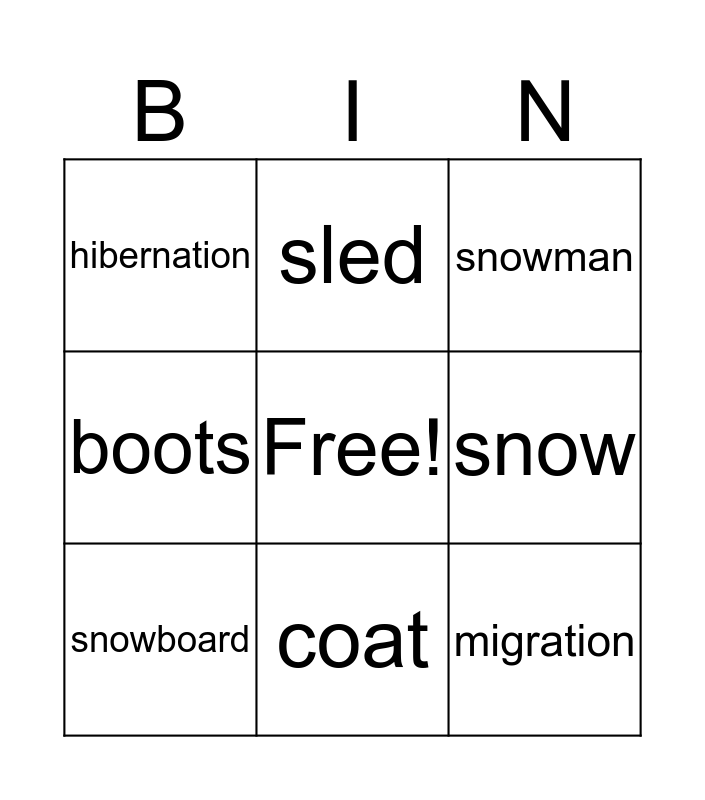 This bingo card has a free space and 8 words: snow, snowman, sled, snowboard, hibernation, migration, boots and coat.