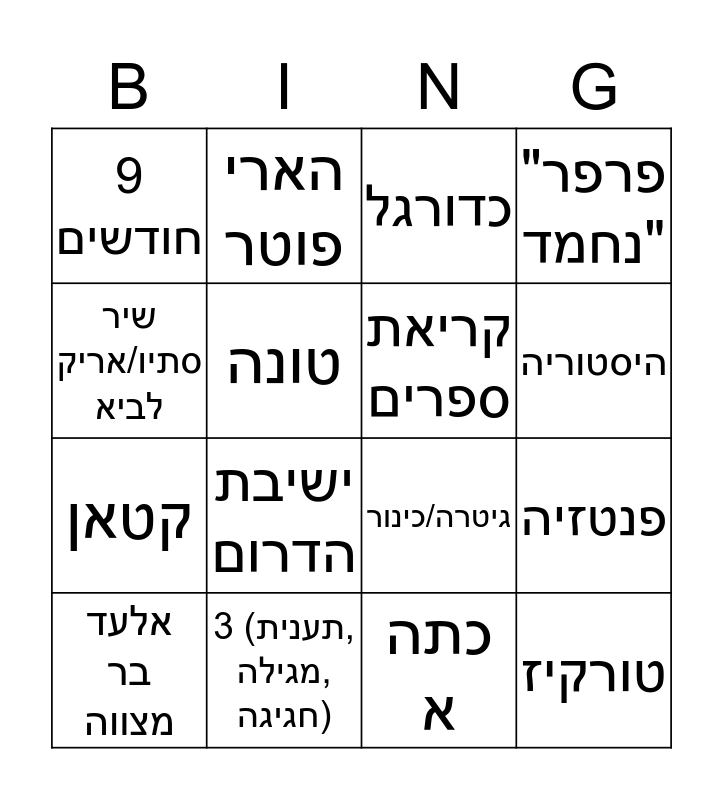 This bingo card has 24 words: אלעד בר מצווה, 4, 3 (תענית, מגילה, חגיגה), כתה א, "פרפר נחמד", 9 חודשים, טונה, כדורגל, פנטזיה, לשון, סטייק, קריאת ספרים, טיסה לקלסיקו, קוסקוס, ישיבת הדרום, 3, טורקיז, שיר סתיו/אריק לביא, מלחמת הכוכבים, גיטרה/כינור, היסטוריה, קטאן, הארי פוטר and kids.