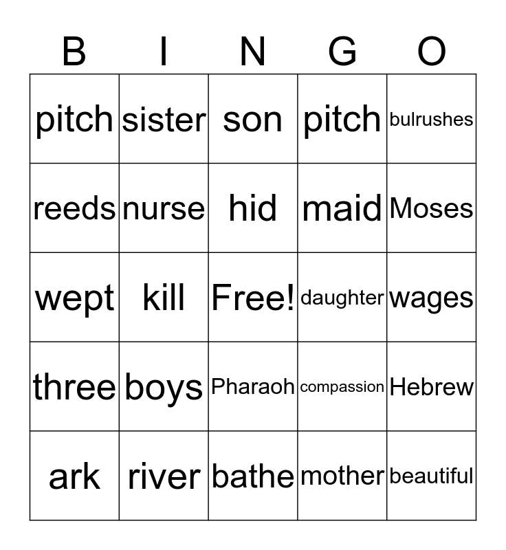 This bingo card has a free space and 24 words: boys, river, hid, ark, bulrushes, pitch, reeds, sister, daughter, Pharaoh, maid, wept, compassion, Hebrew, nurse, mother, wages, son, Moses, kill, beautiful, three, pitch and bathe.