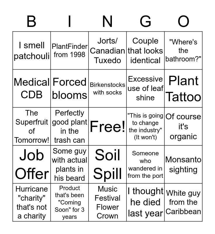 This bingo card has a free space and 24 words: Some guy with actual plants in his beard, Product that's been "Coming Soon" for 3 years, Birkenstocks with socks, Hurricane "charity" that's not a charity, "Where's the bathroom?", I smell patchouli, Medical CDB, PlantFinder from 1998, "This is going to change the industry" (It won't), Soil Spill, Excessive use of leaf shine, The Superfruit of Tomorrow!, Someone who wandered in from the port, Monsanto sighting, Forced blooms, I thought he died last year, Of course it's organic, Jorts/ Canadian Tuxedo, Plant Tattoo, Perfectly good plant in the trash can, White guy from the Caribbean, Job Offer, Couple that looks identical and Music Festival Flower Crown.
