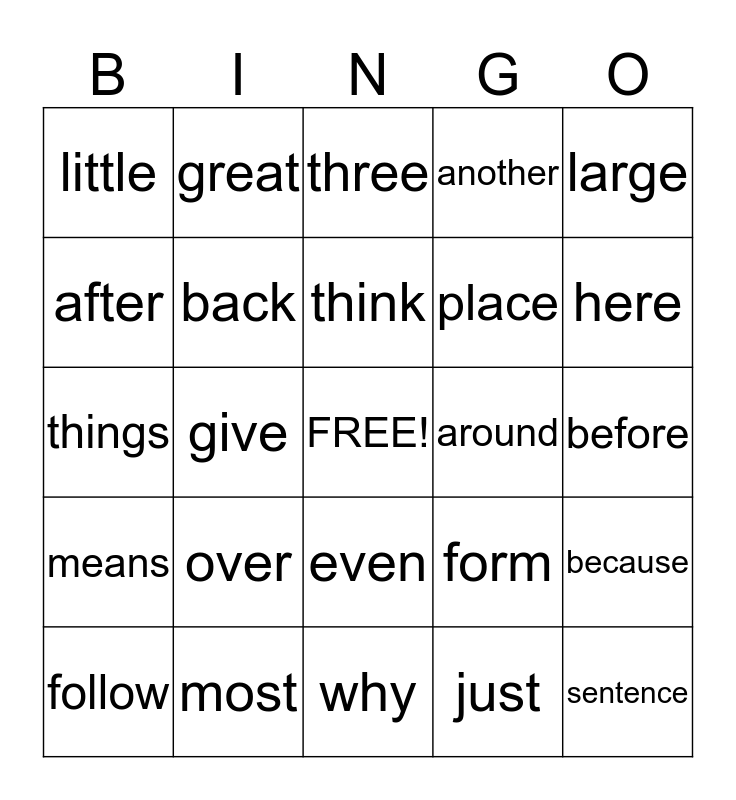 This bingo card has a free space and 24 words: over, most, think, follow, large, little, after, great, around, even, place, things, form, because, back, just, before, three, here, give, sentence, means, another and why.