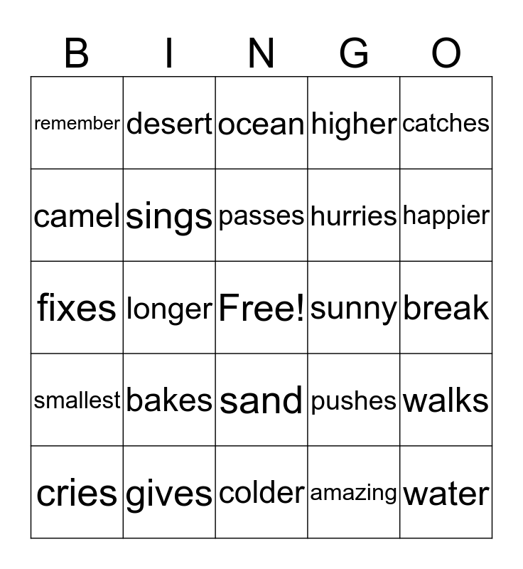 This bingo card has a free space and 24 words: bakes, gives, passes, cries, catches, remember, camel, desert, sunny, sand, hurries, fixes, pushes, walks, sings, amazing, break, ocean, happier, longer, water, smallest, higher and colder.