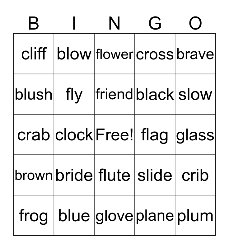 This bingo card has a free space and 30 words: blue, clam, clock, clap, cliff, flower, fly, flute, flag, glove, glass, plum, plane, plug, slow, slice, slide, brown, bride, brave, crab, crow, blow, black, blush, cross, crib, frog, friend and fry.