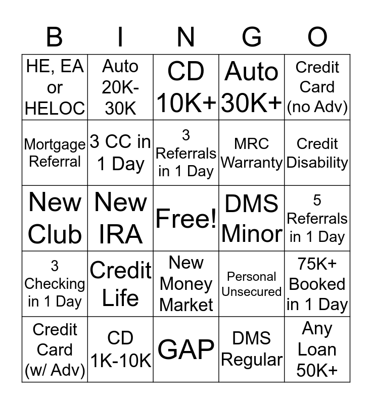 This bingo card has a free space and 24 words: Credit Life, CD 1K-10K, 3 Referrals in 1 Day, Credit Card (w/ Adv), Credit Card (no Adv), HE, EA or HELOC, Mortgage Referral, Auto 20K-30K, DMS Minor, New Money Market, MRC Warranty, New Club, Personal Unsecured, 75K+ Booked in 1 Day, 3 CC in 1 Day, DMS Regular, 5 Referrals in 1 Day, CD 10K+, Credit Disability, New IRA, Any Loan 50K+, 3 Checking in 1 Day, Auto 30K+ and GAP.