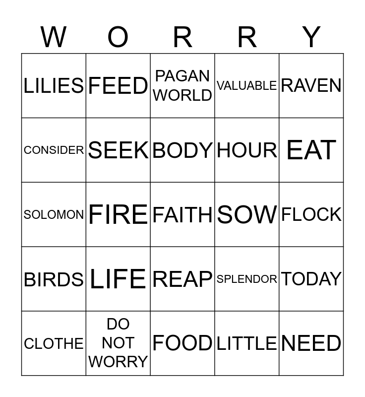 This bingo card has 25 words: LIFE, FOOD, BODY, CLOTHE, RAVEN, LILIES, CONSIDER, FEED, SOW, REAP, HOUR, SOLOMON, SPLENDOR, TODAY, SEEK, NEED, FLOCK, PAGAN WORLD, EAT, FIRE, FAITH, DO NOT WORRY, BIRDS, VALUABLE and LITTLE.
