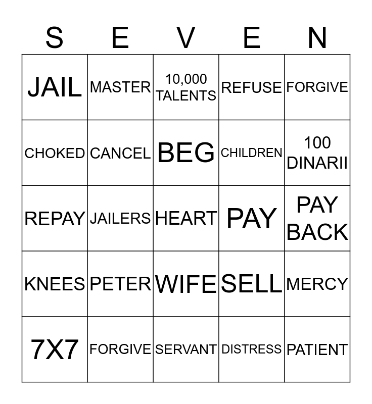 This bingo card has 25 words: PETER, SERVANT, BEG, 7X7, FORGIVE, JAIL, CHOKED, MASTER, PAY, WIFE, CHILDREN, REPAY, SELL, MERCY, CANCEL, PATIENT, PAY BACK, 10,000 TALENTS, 100 DINARII, JAILERS, HEART, FORGIVE, KNEES, REFUSE and DISTRESS.