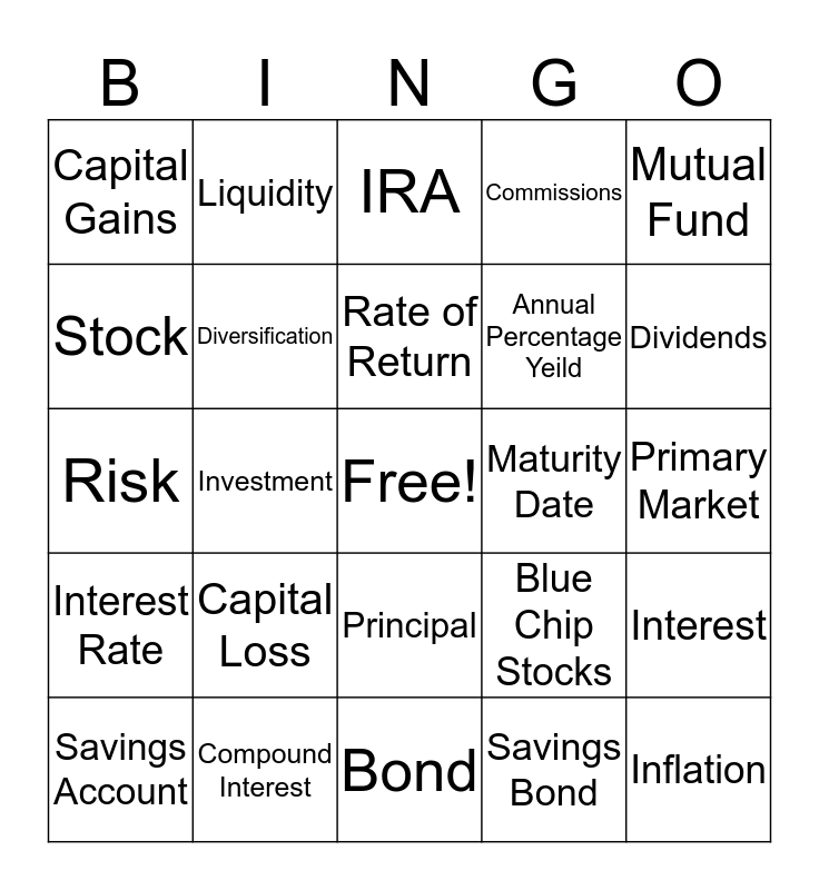 This bingo card has a free space and 29 words: Savings Account, Certificates if Deposit, Bond, Savings Bond, Mutual Fund, Stock, Liquidity, Market Value, Maturity Date, Inflation, Risk, Diversification, Stock Market, Blue Chip Stocks, Primary Market, Secondary Market, Investment, Principal, Commissions, Interest, Interest Rate, Compound Interest, Rate of Return, Annual Percentage Yeild, Dividends, Capital Gains, Capital Loss, IRA and Roth IRA.