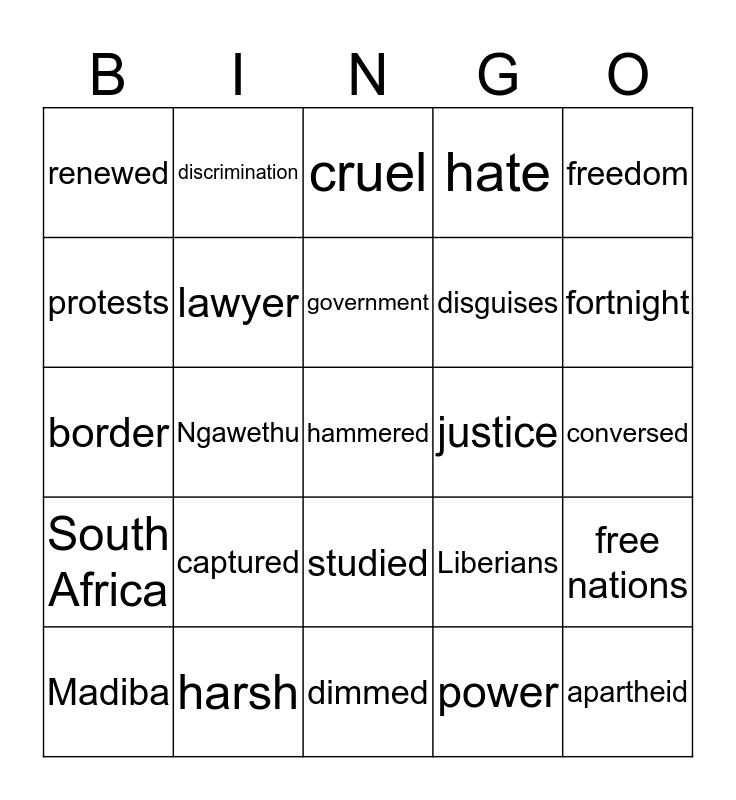 This bingo card has 25 words: captured, dimmed, government, Madiba, freedom, renewed, protests, discrimination, justice, studied, disguises, border, Liberians, free nations, lawyer, apartheid, conversed, cruel, fortnight, Ngawethu, hammered, harsh, South Africa, hate and power.