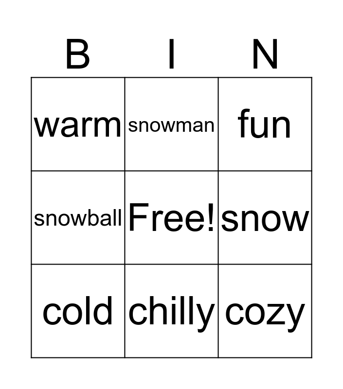 This bingo card has a free space and 8 words: snow, fun, snowman, cold, warm, cozy, snowball and chilly.