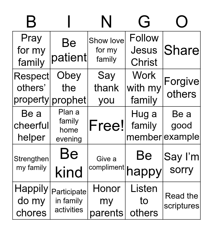 This bingo card has a free space and 24 words: Be kind, Participate in family activities, Say thank you, Happily do my chores, Share, Pray for my family, Respect others’ property, Be patient, Hug a family member, Give a compliment, Work with my family, Be a cheerful helper, Be happy, Say I’m sorry, Obey the prophet, Listen to others, Be a good example, Show love for my family, Forgive others, Plan a family home evening, Read the scriptures, Strengthen my family, Follow Jesus Christ and Honor my parents.