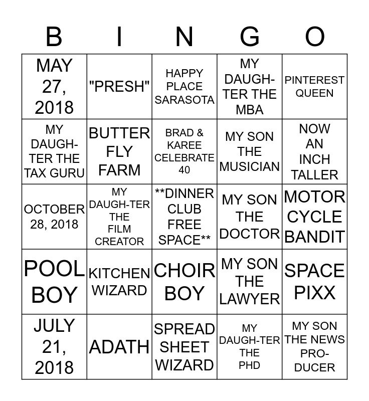 This bingo card has a free space and 24 words: JULY 21, 2018, KITCHEN WIZARD, BRAD & KAREE CELEBRATE 40, MY DAUGH-TER THE PHD, PINTEREST QUEEN, MAY 27, 2018, "PRESH", HAPPY PLACE SARASOTA, MY SON THE DOCTOR, MOTOR CYCLE BANDIT, OCTOBER 28, 2018, BUTTER FLY FARM, MY SON THE LAWYER, SPACE PIXX, MY DAUGH-TER THE TAX GURU, ADATH, SPREAD SHEET WIZARD, MY DAUGH-TER THE MBA, NOW AN INCH TALLER, POOL BOY, MY DAUGH-TER THE FILM CREATOR, CHOIR BOY, MY SON THE MUSICIAN and MY SON THE NEWS PRO-DUCER.