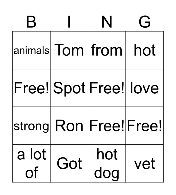 This bingo card has 16 words: Got, Free!, from, animals, strong, Tom, Free!, hot dog, Free!, Spot, a lot of, hot, Ron, love, Free! and vet.