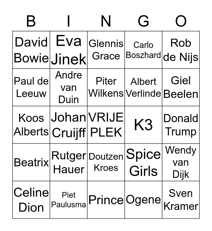 This bingo card has a free space and 40 words: Thijs Romer, Koos Alberts, Justin Bieber, Andre van Duin, Piet Paulusma, Doutzen Kroes, Piter Wilkens, Syb vd Ploeg, Rob de Nijs, Beatrix, Johan Cruijff, Carlo Boszhard, Sven Kramer, Donald Trump, K3, Rutger Hauer, Mies Bouman, David Bowie, Anouk, Glennis Grace, Wendy van Dijk, Ogene, Albert Verlinde, Paul de Leeuw, Pharrel Williams, Adele, Nielson, Willeke Alberti, Marco Borsato, Linda de Mol, George Michael, Celine Dion, Anneke Douma, Spice Girls, Giel Beelen, Prince, Henk Angenent, Patty Brard, Eva Jinek and Jan Smit.