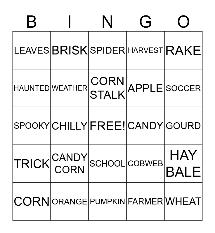 This bingo card has a free space and 55 words: SCARECROW, CORN, FALL, LEAVES, PUMPKIN, HALLOWEEN, WEATHER, AUTUMN, APPLE, FOOTBALL, HARVEST, SEASON, SEPTEMBER, OCTOBER, HAYRIDE, CIDER, RAKE, CHILLY, ACORN, WHEAT, CANDY, BAT, COBWEB, SPIDER, JACK-O-LANTERN, CORN STALK, FARMER, GHOST, GOURD, HAY BALE, PINECONE, TREAT, COLD, FOGGY, HAUNTED, SPOOKY, CARVE, TRICK, BONFIRE, BROOM, BRISK, TRICK-OR-TREAT, SMORES, HOT DOGS, CANDY CORN, ORANGE, RED, YELLOW, BROWN, SOCCER, STRAW, FROST, COSTUME, SCHOOL and COLORFUL.