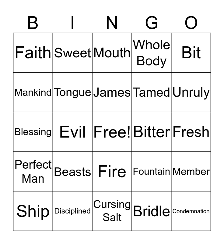 This bingo card has a free space and 24 words: Beasts, Disciplined, James, Ship, Bit, Faith, Mankind, Sweet, Bitter, Fire, Tamed, Blessing, Fountain, Member, Tongue, Bridle, Fresh, Mouth, Unruly, Evil, Condemnation, Perfect Man, Whole Body and Cursing Salt.
