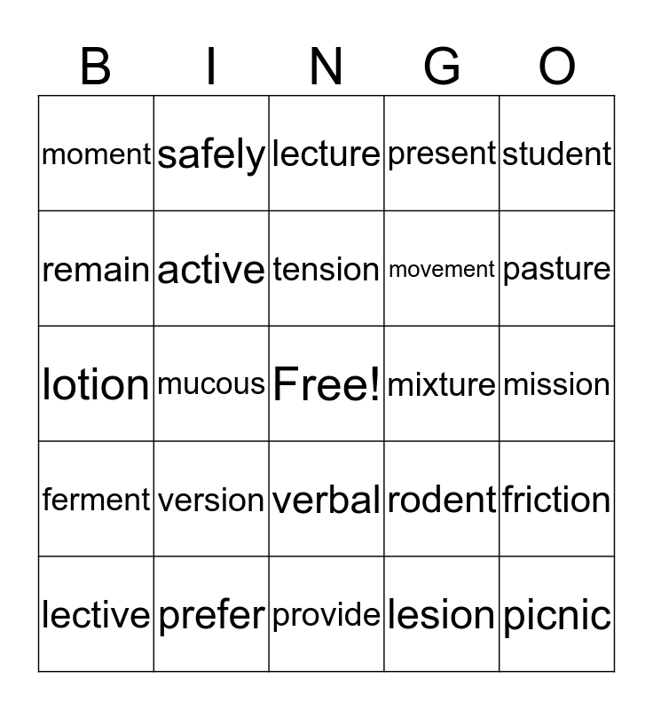 This bingo card has a free space and 24 words: version, prefer, tension, lective, student, moment, remain, safely, mixture, verbal, movement, lotion, rodent, friction, active, lesion, mission, lecture, pasture, mucous, picnic, ferment, present and provide.