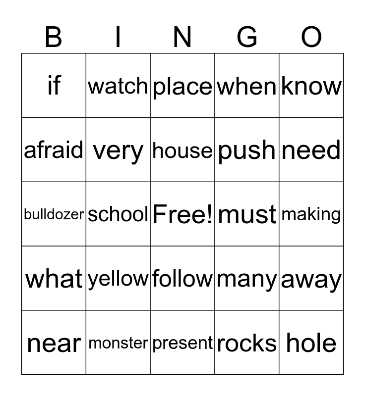 This bingo card has a free space and 24 words: yellow, monster, house, near, know, if, afraid, watch, must, follow, push, bulldozer, many, away, very, rocks, making, place, need, school, hole, what, when and present.