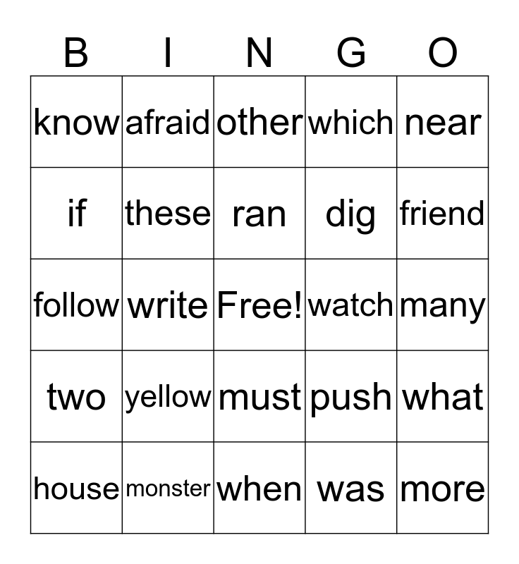 This bingo card has a free space and 24 words: yellow, monster, ran, house, near, know, if, afraid, watch, must, dig, follow, push, what, these, was, many, other, friend, write, more, two, which and when.