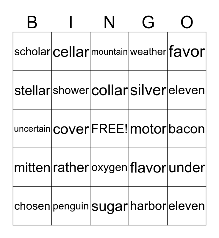 This bingo card has a free space and 48 words: broken, eleven, power, sugar, rather, tractor, cellar, mirror, stellar, solar, shower, weather, under, flavor, other, doctor, collar, motor, grammar, favor, cover, harbor, scholar, silver, broken, eleven, chosen, frighten, oxygen, mitten, dolphin, margin, pumpkin, cabin, penguin, napkin, cotton, bacon, button, dragon, common, gallon, mountain, captain, uncertain, bargain, fountain and curtain.