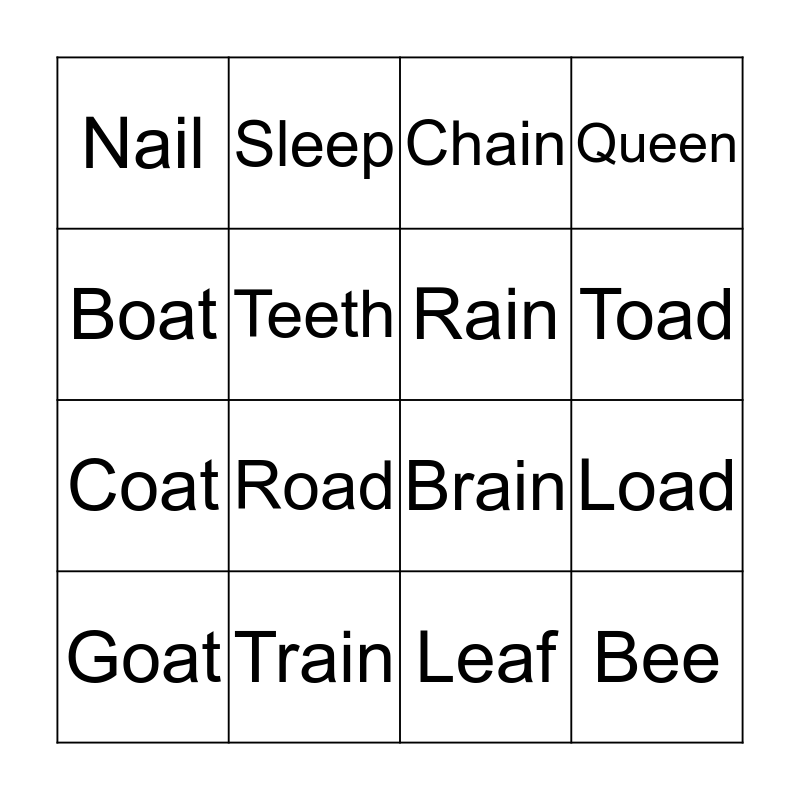 This bingo card has 16 words: Train, Load, Chain, Nail, Coat, Sleep, Brain, Leaf, Boat, Teeth, Goat, Queen, Road, Toad, Rain and Bee.
