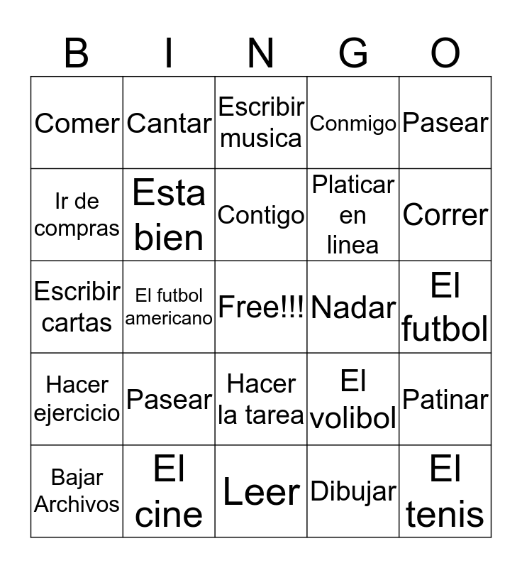 This bingo card has a free space and 24 words: Bajar Archivos, Pasear, Contigo, Dibujar, Pasear, Comer, Cantar, Escribir musica, Nadar, El futbol, Escribir cartas, Esta bien, El volibol, Patinar, Ir de compras, El cine, Leer, Conmigo, Correr, Hacer ejercicio, El futbol americano, Hacer la tarea, Platicar en linea and El tenis.
