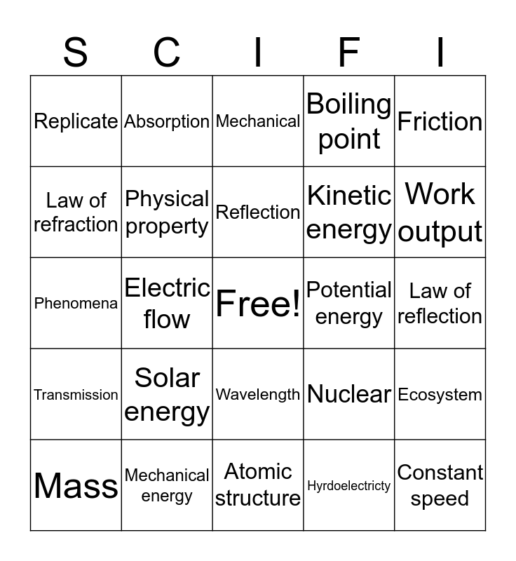 This bingo card has a free space and 56 words: Volume, Mass, Density, Replicate, Atomic structure, Periodic table, Physical property, Chemical property, Kinetic energy, Physical phases, Boiling point, Freezing point, Melting point, Reactants, One-demensional motion, Deceleration, Friction, Electric flow, Unbalanced forces, Constant speed, Potential energy, Kinetic energy, Nuclear, Mechanical, Transmission, Reflection, Absorption, Work input, Work output, Law of conservation of energy, Energy transformation, Electromagnetic, Wavelength, Frequency amplitude, Law of reflection, Law of refraction, Phenomena, Reflection, Transmission, Absorption, Wavelength, Conduction, Convection, Radiation, Magnetism, Solar energy, Mechanical energy, Exothermic, Endothermic, Chemical reaction, Hyrdoelectricty, Renewable, Non renewable, Inexhaustible, Ecosystem and Soil conservation.