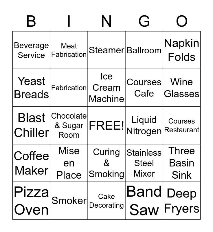 This bingo card has a free space and 24 words: Mise en Place, Smoker, Ice Cream Machine, Pizza Oven, Napkin Folds, Beverage Service, Yeast Breads, Meat Fabrication, Liquid Nitrogen, Curing & Smoking, Courses Cafe, Blast Chiller, Stainless Steel Mixer, Three Basin Sink, Fabrication, Band Saw, Courses Restaurant, Steamer, Wine Glasses, Chocolate & Sugar Room, Deep Fryers, Coffee Maker, Ballroom and Cake Decorating.