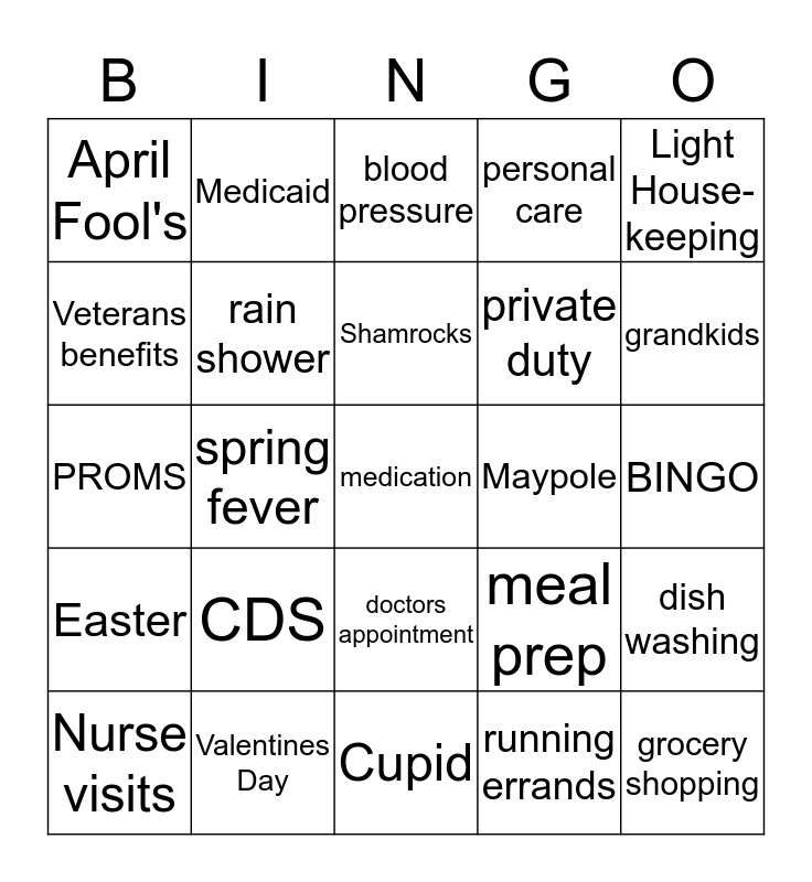 This bingo card has 25 words: CDS, Cupid, Shamrocks, Nurse visits, Light House- keeping, April Fool's, Veterans benefits, Medicaid, Maypole, doctors appointment, private duty, PROMS, meal prep, dish washing, rain shower, grocery shopping, BINGO, blood pressure, grandkids, spring fever, medication, Valentines Day, Easter, personal care and running errands.