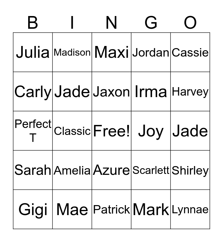 This bingo card has a free space and 24 words: Amelia, Mae, Jaxon, Gigi, Cassie, Julia, Carly, Madison, Joy, Azure, Irma, Perfect T, Scarlett, Shirley, Jade, Mark, Jade, Maxi, Harvey, Classic, Lynnae, Sarah, Jordan and Patrick.