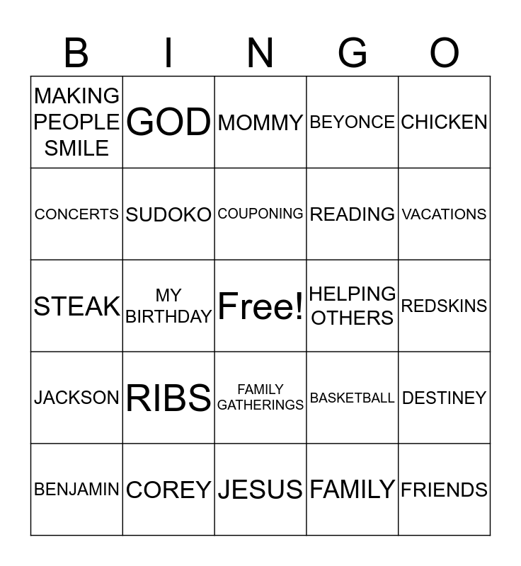 This bingo card has a free space and 24 words: BENJAMIN, RIBS, COUPONING, FAMILY, CHICKEN, MAKING PEOPLE SMILE, GOD, MOMMY, HELPING OTHERS, REDSKINS, STEAK, SUDOKO, BASKETBALL, DESTINEY, CONCERTS, COREY, JESUS, BEYONCE, VACATIONS, JACKSON, MY BIRTHDAY, FAMILY GATHERINGS, READING and FRIENDS.