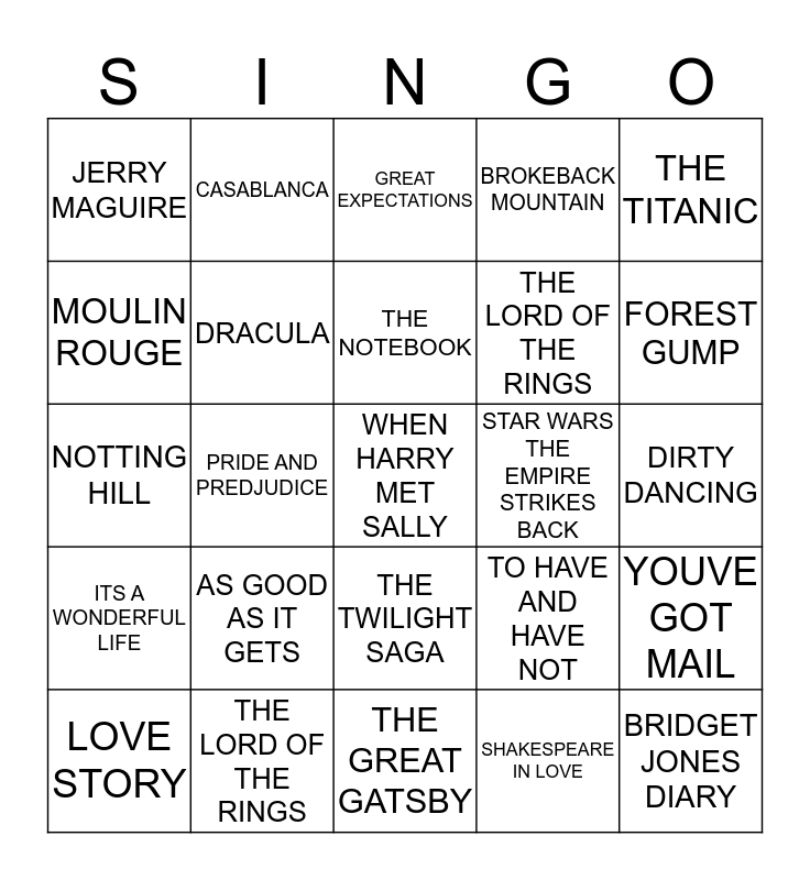 This bingo card has 25 words: AS GOOD AS IT GETS, THE GREAT GATSBY, THE NOTEBOOK, LOVE STORY, THE TITANIC, JERRY MAGUIRE, MOULIN ROUGE, CASABLANCA, STAR WARS THE EMPIRE STRIKES BACK, THE TWILIGHT SAGA, THE LORD OF THE RINGS, NOTTING HILL, TO HAVE AND HAVE NOT, YOUVE GOT MAIL, DRACULA, BRIDGET JONES DIARY, DIRTY DANCING, GREAT EXPECTATIONS, FOREST GUMP, PRIDE AND PREDJUDICE, WHEN HARRY MET SALLY, THE LORD OF THE RINGS, ITS A WONDERFUL LIFE, BROKEBACK MOUNTAIN and SHAKESPEARE IN LOVE.