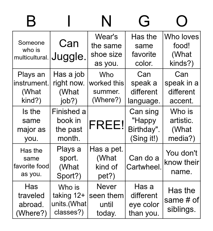 This bingo card has a free space and 24 words: Plays a sport. (What Sport?), Who is taking 12+ units.(What classes?), Who worked this summer.(Where?), Has traveled abroad. (Where?), Who loves food! (What kinds?), Someone who is multicultural., Plays an instrument. (What kind?), Can Juggle., Can sing "Happy Birthday". (Sing it!), Has a pet. (What kind of pet?), Can speak a different language., Is the same major as you., Can do a Cartwheel., You don't know their name., Has a job right now. (What job?), Has a different eye color than you., Who is artistic. (What media?), Wear's the same shoe size as you., Can speak in a different accent., Finished a book in the past month., Has the same # of siblings., Has the same favorite food as you., Has the same favorite color. and Never seen them until today..