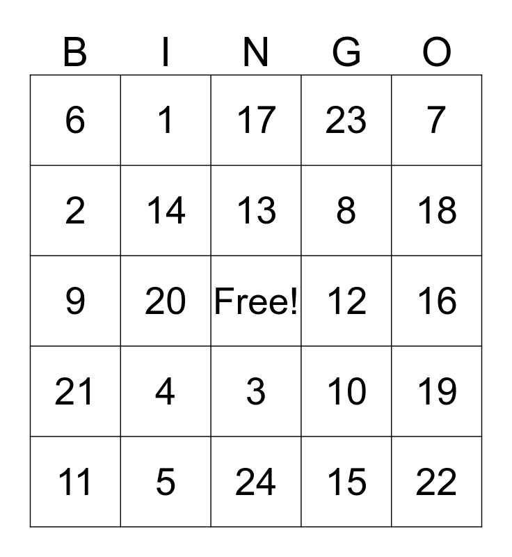 This bingo card has a free space and 24 words: 4, 5, 13, 11, 7, 6, 2, 1, 12, 3, 8, 9, 10, 19, 14, 15, 16, 17, 18, 20, 22, 21, 23 and 24.