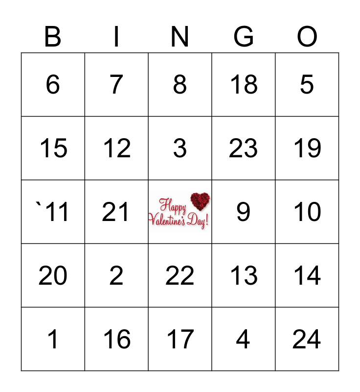 This bingo card has a free space and 24 words: 1, 2, 3, 4, 5, 6, 7, 8, 9, 10, `11, 12, 13, 14, 15, 16, 17, 18, 19, 20, 21, 22, 23 and 24.