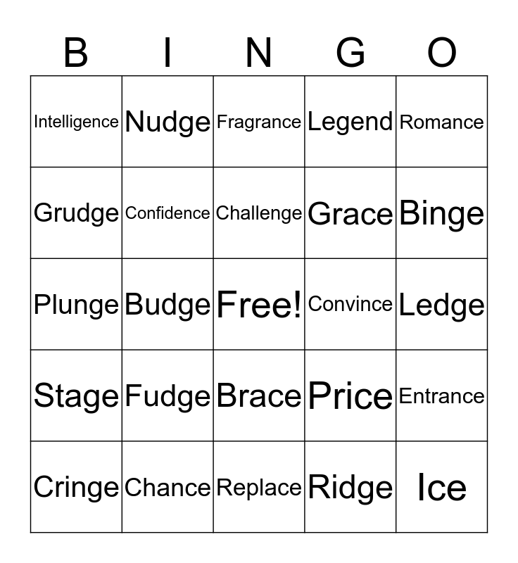 This bingo card has a free space and 24 words: Fudge, Chance, Challenge, Cringe, Romance, Intelligence, Grudge, Nudge, Convince, Brace, Grace, Plunge, Price, Entrance, Confidence, Ridge, Ledge, Fragrance, Binge, Budge, Ice, Stage, Legend and Replace.