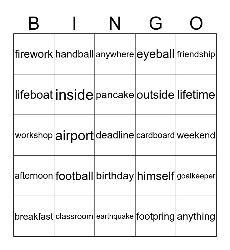 This bingo card has a free space and 24 words: football, classroom, pancake, breakfast, friendship, firework, lifeboat, handball, cardboard, birthday, outside, workshop, himself, goalkeeper, inside, footpring, weekend, anywhere, lifetime, airport, anything, afternoon, eyeball and earthquake.