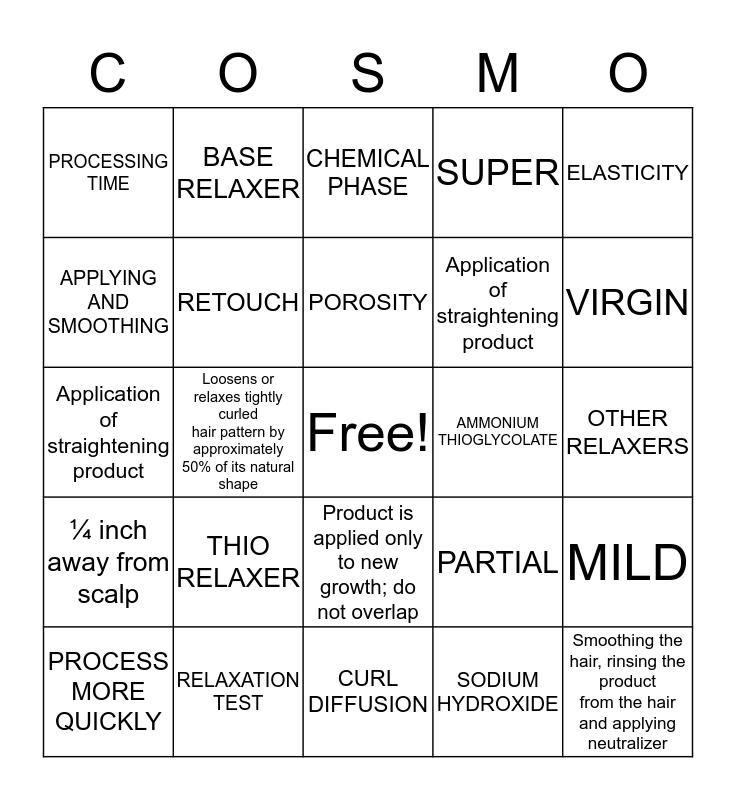 This bingo card has a free space and 24 words: PROCESS MORE QUICKLY, THIO RELAXER, POROSITY, SODIUM HYDROXIDE, ELASTICITY, PROCESSING TIME, BASE RELAXER, CHEMICAL PHASE, AMMONIUM THIOGLYCOLATE, OTHER RELAXERS, Application of straightening product, RETOUCH, PARTIAL, MILD, APPLYING AND SMOOTHING, RELAXATION TEST, CURL DIFFUSION, SUPER, VIRGIN, ¼ inch away from scalp, Loosens or relaxes tightly curled hair pattern by approximately 50% of its natural shape, Product is applied only to new growth; do not overlap, Application of straightening product and Smoothing the hair, rinsing the product from the hair and applying neutralizer.