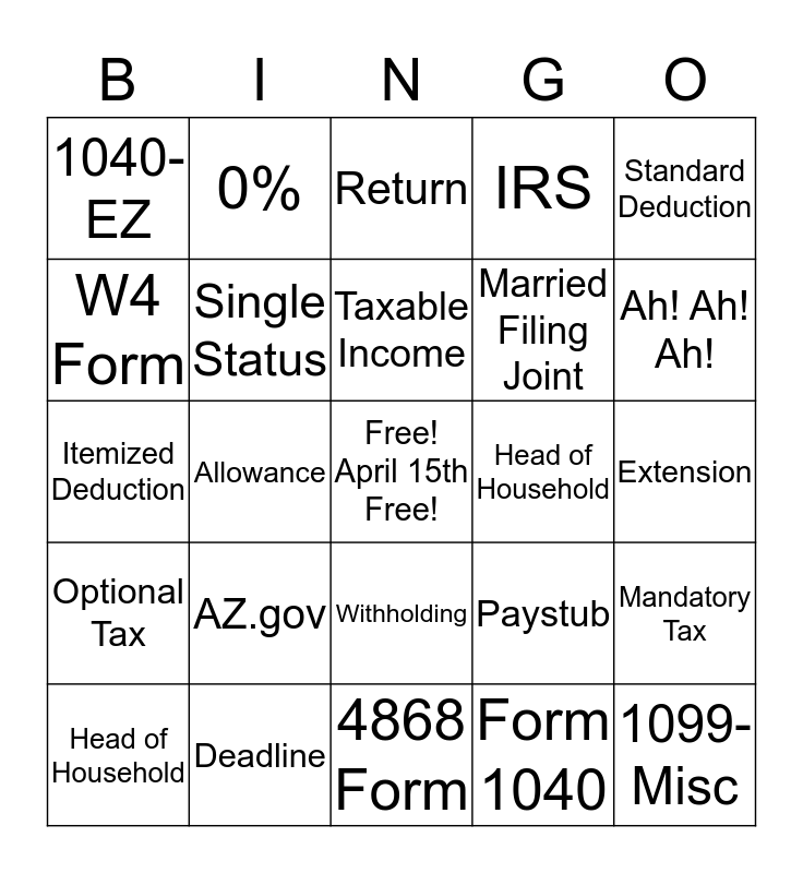 This bingo card has a free space and 24 words: Head of Household, AZ.gov, Taxable Income, Form 1040, Standard Deduction, 1040-EZ, 0%, Return, Head of Household, Extension, Itemized Deduction, Single Status, Paystub, Mandatory Tax, W4 Form, Deadline, 4868 Form, IRS, Ah! Ah! Ah!, Optional Tax, Allowance, Withholding, Married Filing Joint and 1099-Misc.