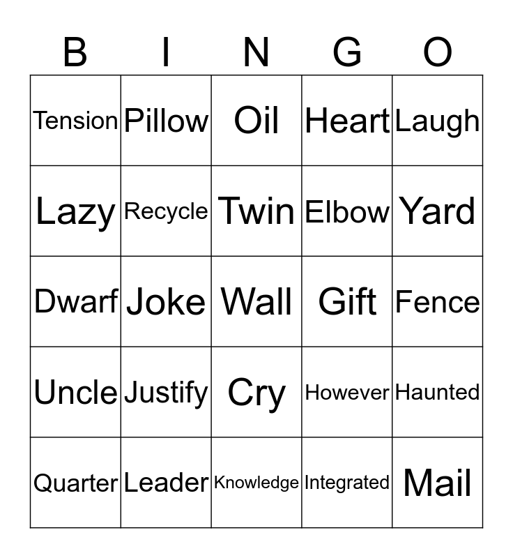 This bingo card has 25 words: Justify, Knowledge, Twin, Quarter, Laugh, Tension, Lazy, Pillow, Gift, Cry, Elbow, Dwarf, However, Haunted, Recycle, Mail, Fence, Oil, Yard, Joke, Wall, Leader, Uncle, Heart and Integrated.