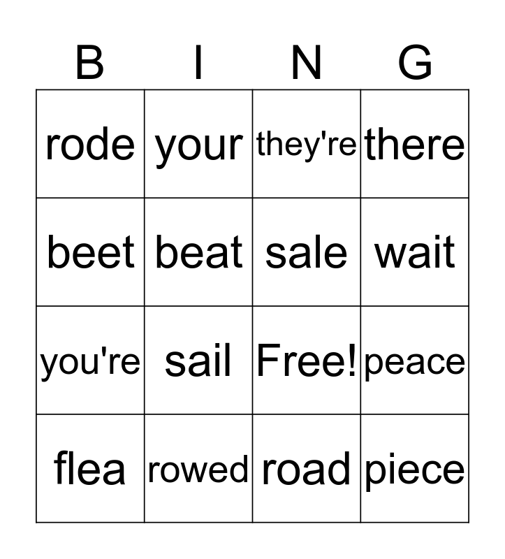 This bingo card has 19 words: Free!, their, they're, piece, peace, beet, road, rode, your, you're, sail, beat, sale, rowed, flea, flee, there, wait and weight.