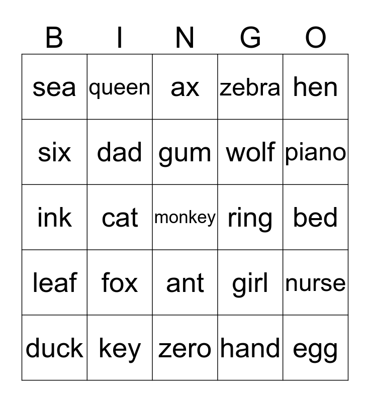 This bingo card has 44 words: Free!, monkey, elf, duck, yogurt, hand, ax, fan, hen, key, zebra, ring, ant, fox, nose, zero, bag, ink, jam, piano, queen, umbrella, jet, sea, jungle, bed, lion, bat, girl, leaf, pig, nurse, orange, sun, cat, water, table, egg, gum, six, wolf, fish, dad and apple.