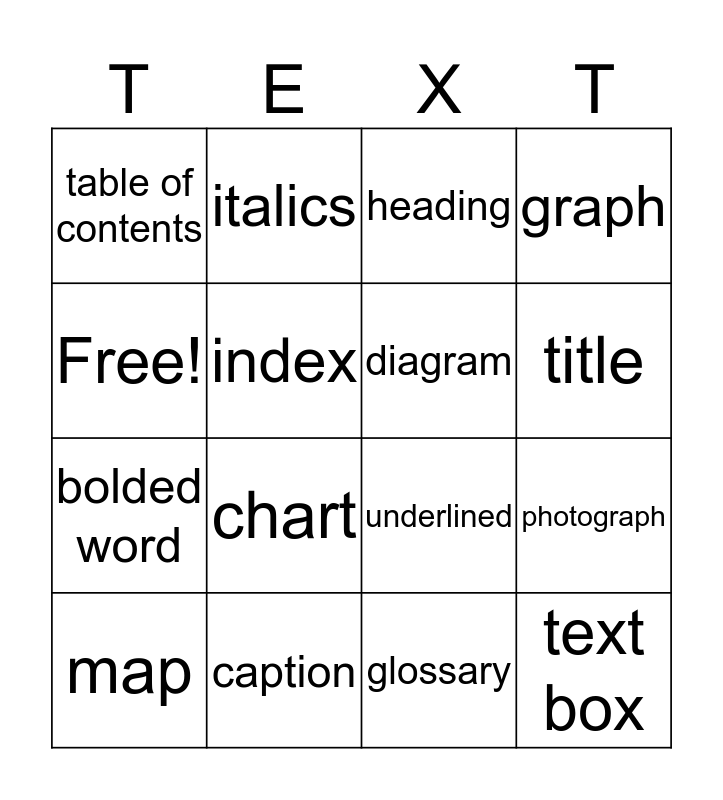 This bingo card has 16 words: caption, photograph, heading, table of contents, bolded word, italics, underlined, glossary, Free!, index, map, graph, chart, title, diagram and text box.