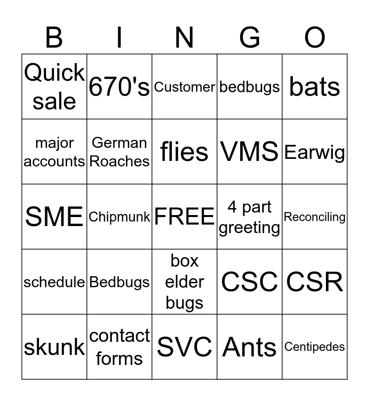 This bingo card has a free space and 24 words: Bedbugs, contact forms, flies, skunk, bats, Quick sale, major accounts, 670's, 4 part greeting, box elder bugs, VMS, SME, CSC, CSR, German Roaches, Ants, Reconciling, Customer, Earwig, Chipmunk, Centipedes, schedule, bedbugs and SVC.